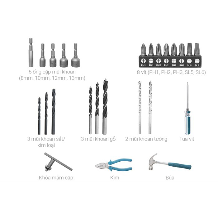 • Được trang bị 26 phụ kiện đi kèm, giúp tiết kiệm chi phí và thời gian tìm kiếm dụng cụ.